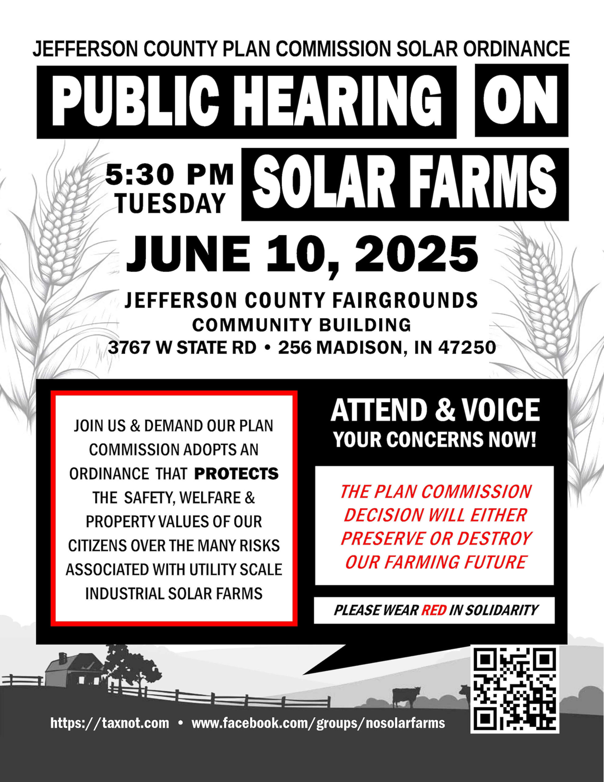 The Jefferson County Plan Commission will hold a public hearing on their recommended amendments to the Unified Development Ordinance (UDO) addressing industrial Solar on our farmland. Utility Scaled industrial solar plants cover hundreds and thousands of acres with leases extending decades affecting future generations.